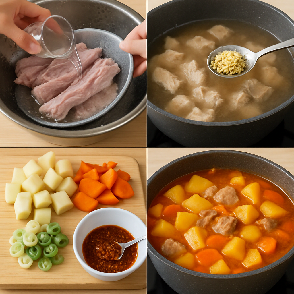 - 본 끓이기: 고기 국물에 감자, 야채, 양념장을 넣고 20분 이상 끓임.