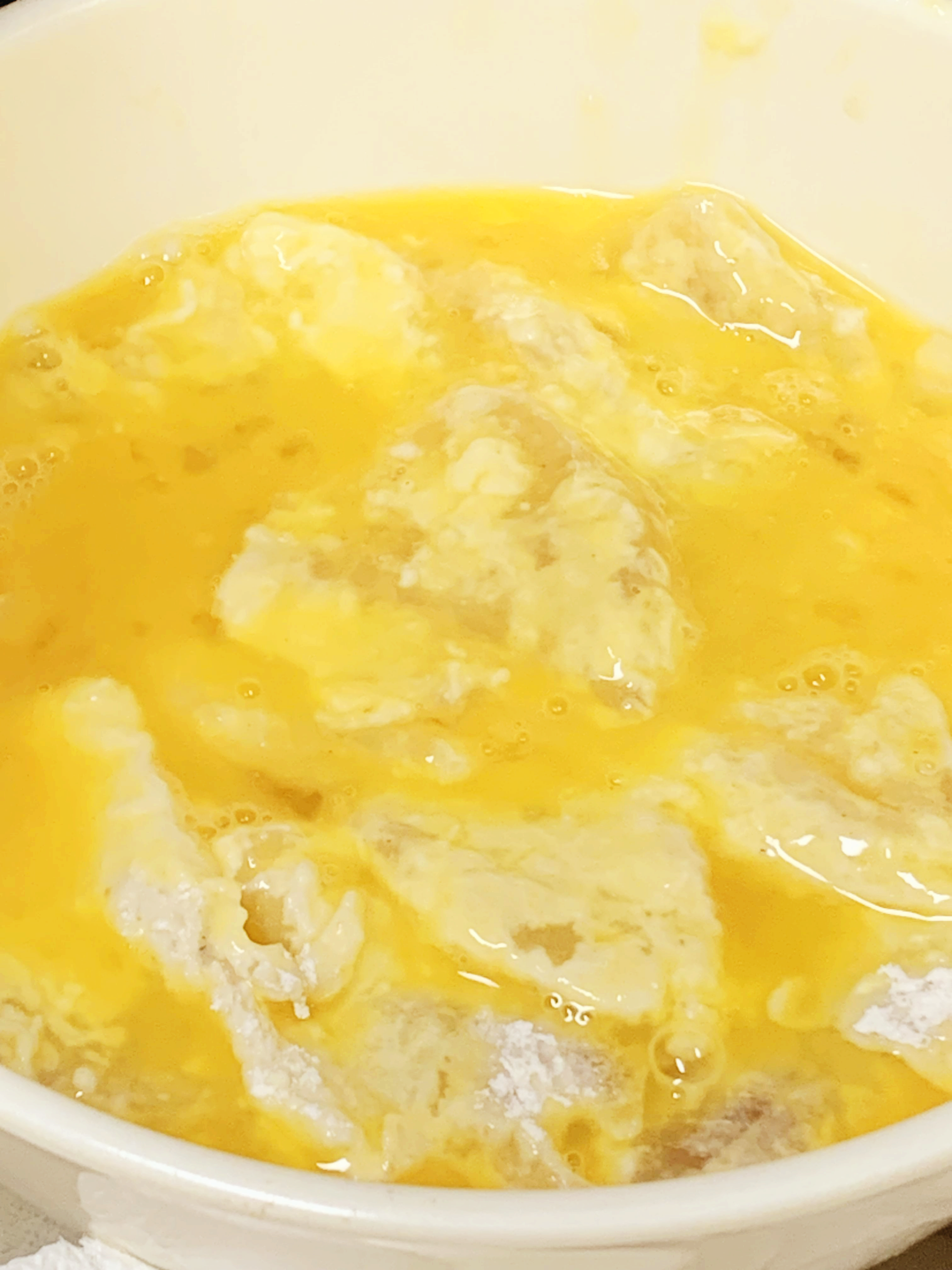 - 계란을 풀어서 그릇에 담고 하나씩 밀가루가 묻혀진 동태에 계란을 잘 묻혀줍니다.