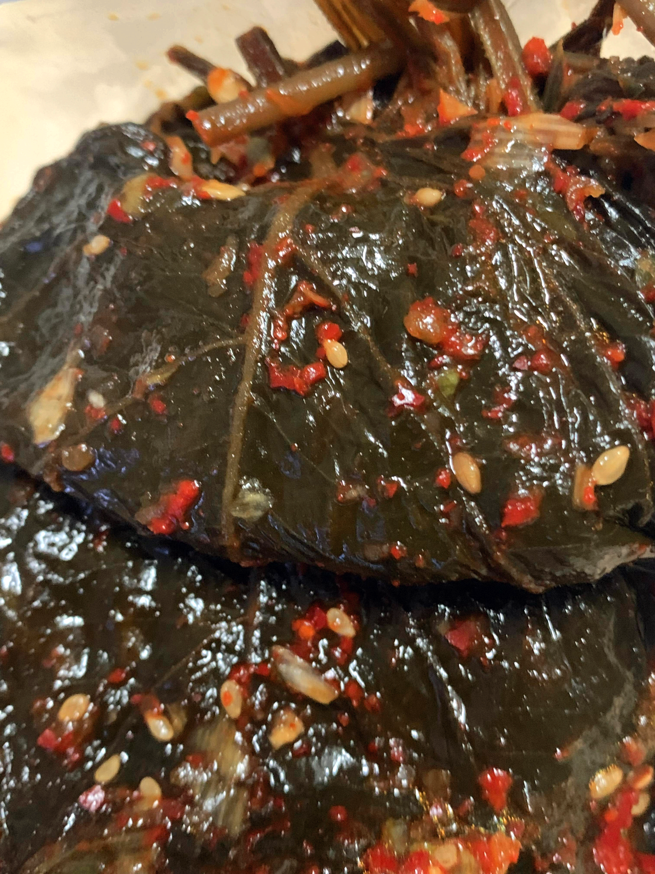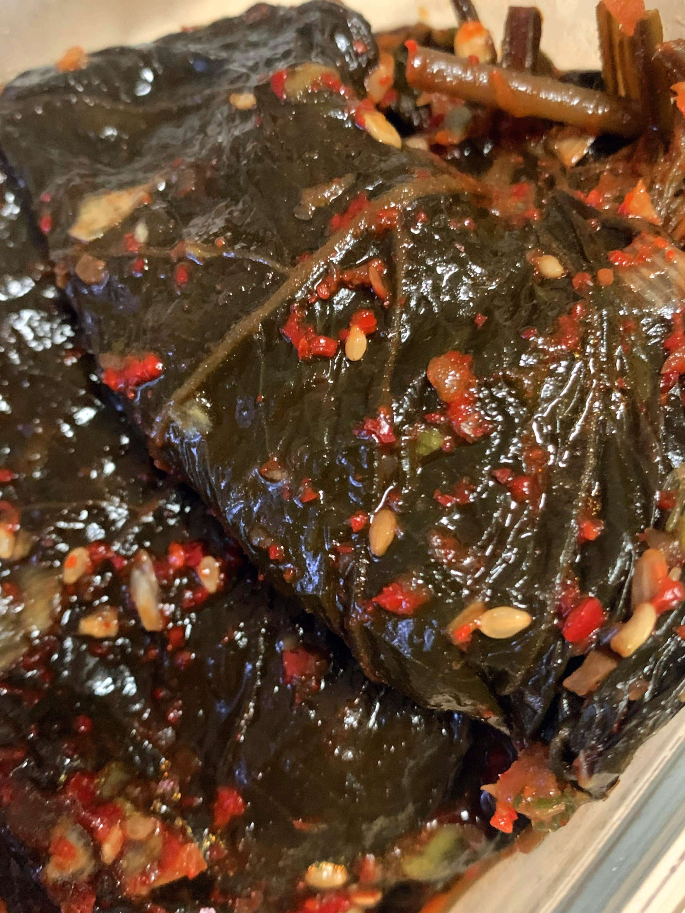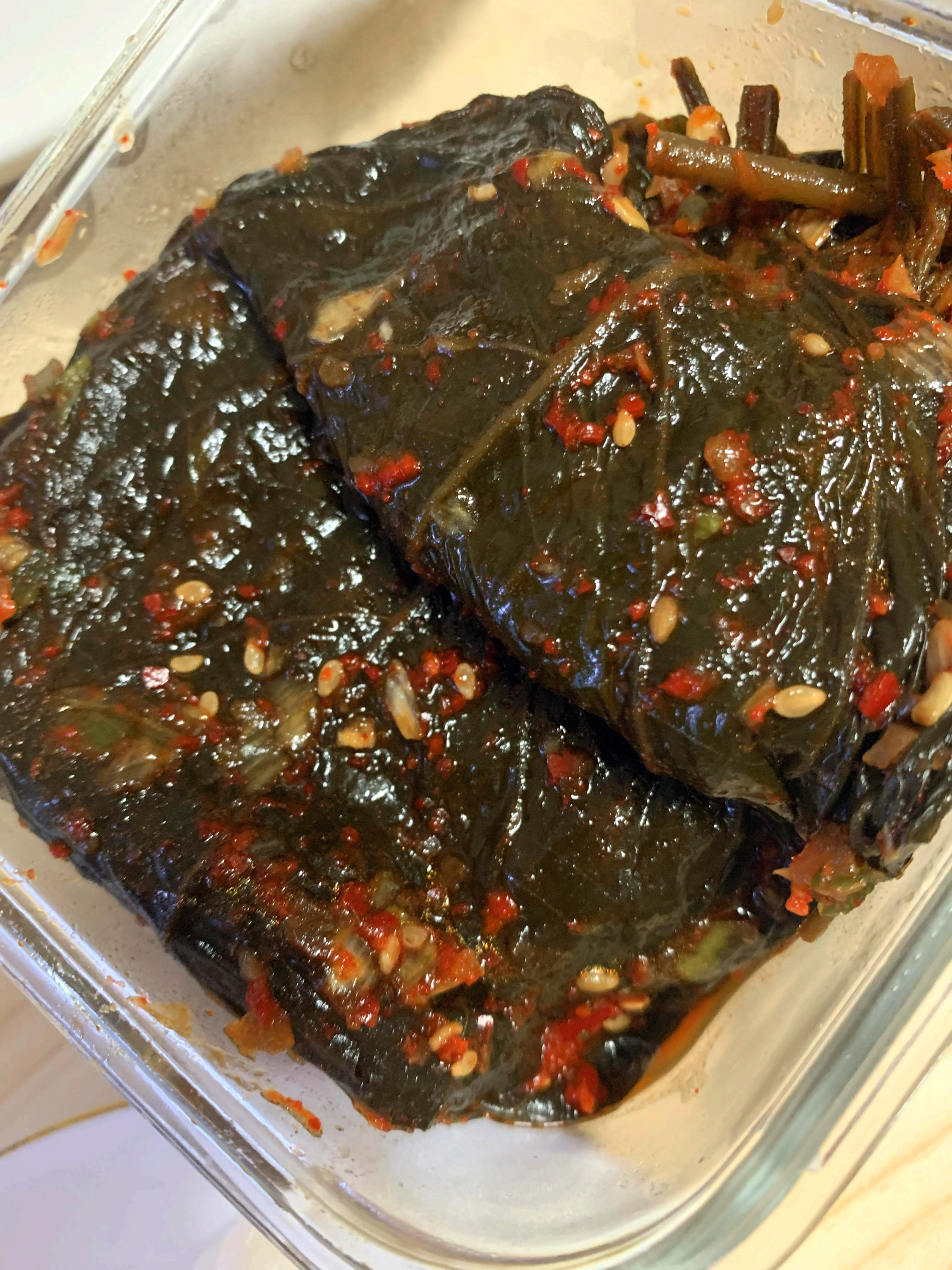 - 양념에 잘 절여진 깻잎을 넣고 양념이 깻잎에 골고루 묻도록 해줍니다.